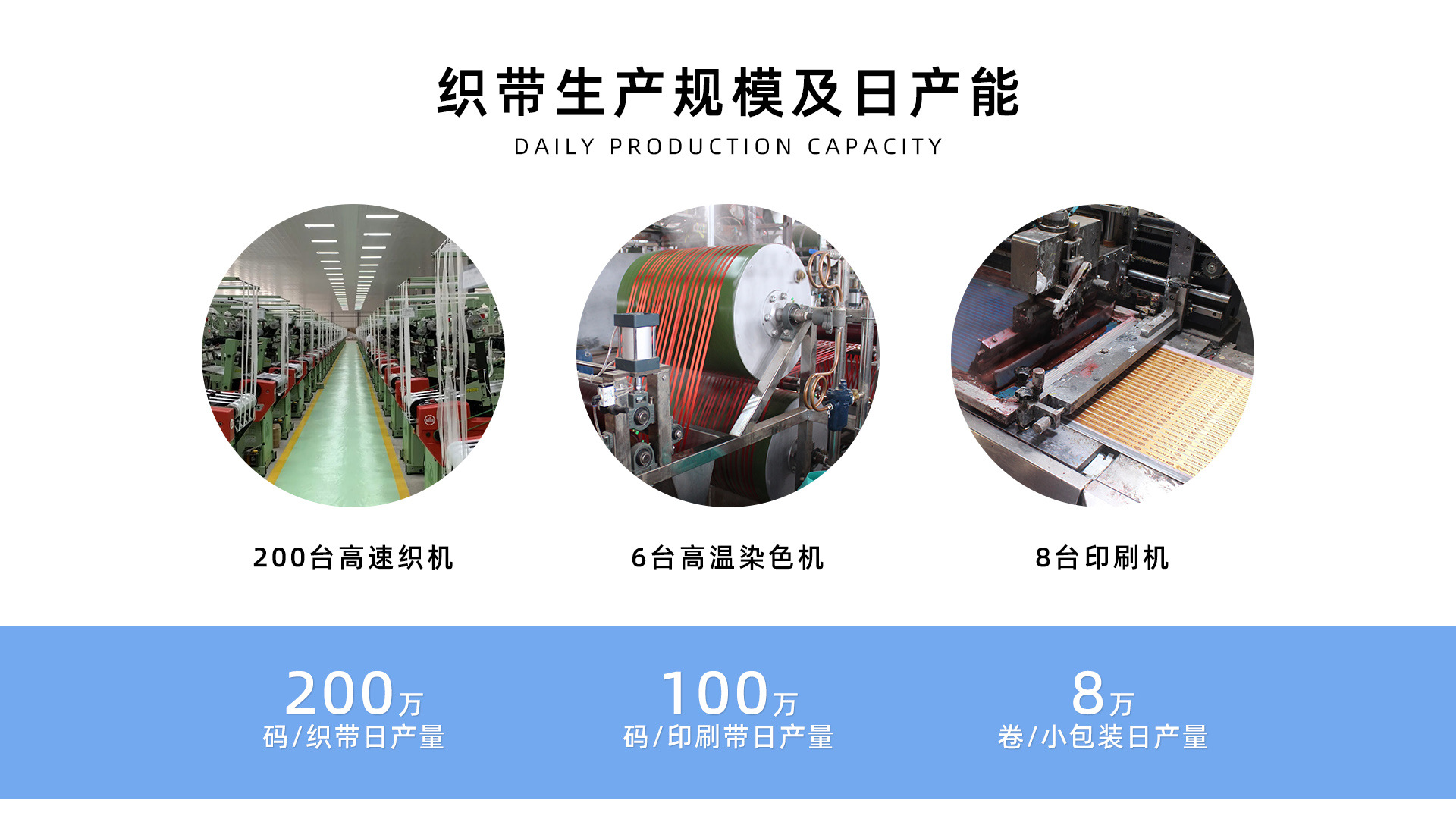 公司简介: 潍坊北海纺织有限公司是一家集设计,生产与销售各类织带的为一体现代化综合性企业。 公司座落于美丽的蓝宝石之都-山东·昌乐。拥有自己独立的织带及染色设备,可根据客户需要生产各类特殊品种的织带。公司发展至今,产品主要包 括:缎带、涤纶带、罗纹带、纱带、丝绒带、松紧绒带、细条纹带、印花带、格子带、圣诞带、礼品带等;以及银行、电力部门所用的警示带、根据客户提供样品生 产的其他类织带、服装用、工艺礼品包扎用、玩具用、抽纱绣品家用纺织品用织带辅料;订织订染各类织带。 “北海织带”专注于专业化和规模化生产,打造高品质产品,树立企业优异形象,企业信誉和产品质量在织带行业内公认最好,公司产品远销世界100多个国家和地区,在国内的市场占有率稳步提升。正确的经营理念和经营策略使公司得到了迅猛的发展。 潍...